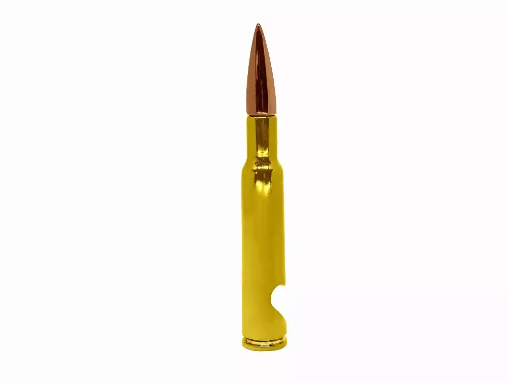 Abridor de garrafa inspirado na .50 BMG, conhecido como 50 Browning. Esse cartucho foi projetado no início da década de 1910 e posto para uso oficial a partir de 1921, e então