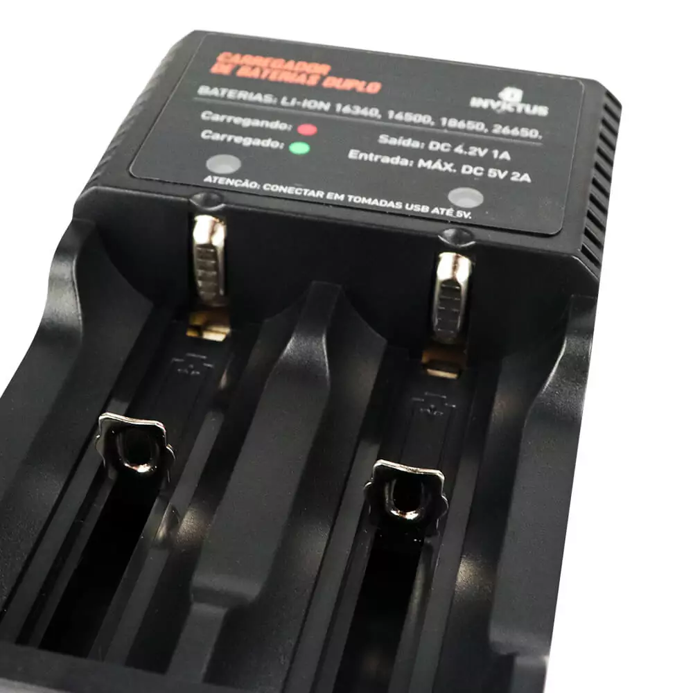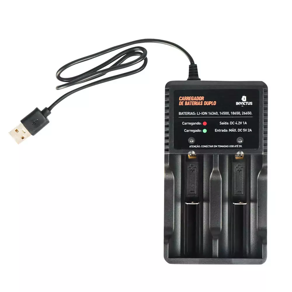O Carregador de Bateria de lítio Enterprise da marca INVICTUS serve para ser utilizado no carregamento de baterias de lítio 14500, 16340, 18650 e 26650, tendo seu compartimento retrátil. Ele funciona através de cabo USB, que pode ser conectado no notebook, no computador, na fonte de celular, em veículos, powerbank, entre outros dispositivos com interface USB. Compacto e leve, o Enterprise foi projetado para oferecer segurança, praticidade e alta eficiência, onde cada slot de bateria controla e carrega de forma independente.
