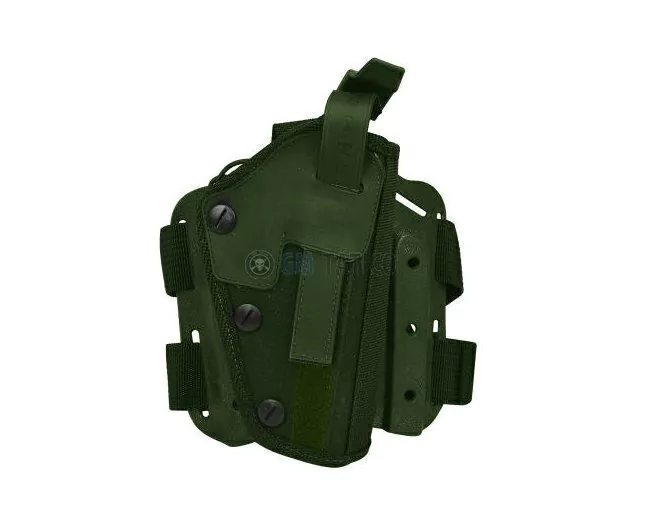 Confeccionado em Nylon híper resistente esse modelo de coldre possui fitas com regulagem de altura presa no fechamento do coldre para evitar que o fechamento superior se abra durante operações táticas. Pode ser totalmente ajustado e fixado na perna e também no cinto. Conta com um bolso lateral para transportar pequenos acessórios como canivetes, etc, além de revestimento interno que garante total segurança da sua Pistola.