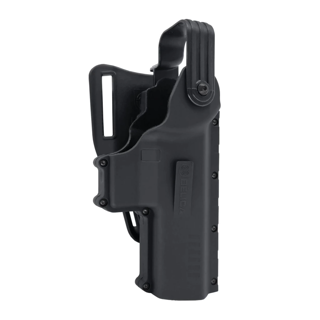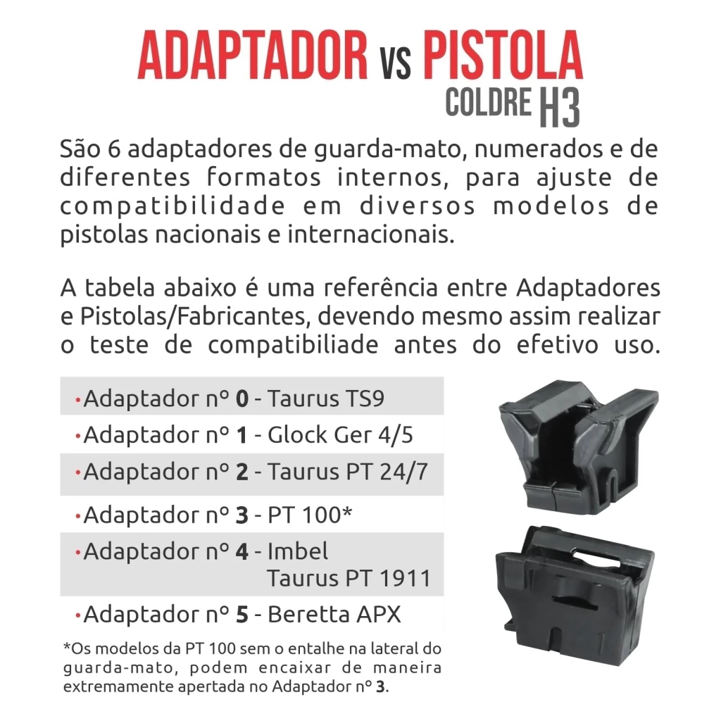 O Coldre H3 Bélica é a união de operacionalidade e desempenho, contando com novo revestimento interno, bem como um design remodelado para dar uma empunhadura perfeita no momento do saque. Possui 6 adaptadores de guarda-mato para ajuste da retenção passiva, assim evitando que seu equipamento coldreado fique solto.
