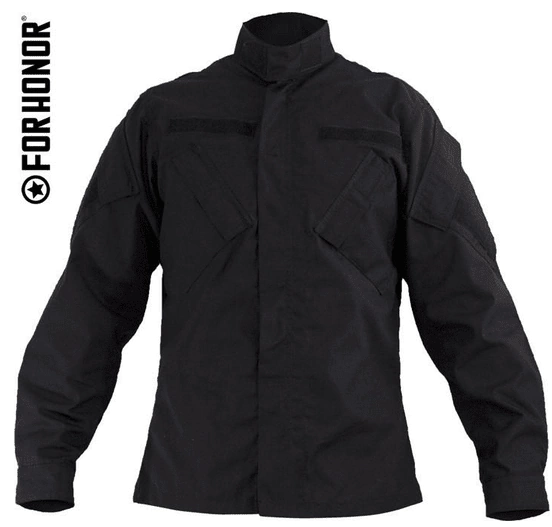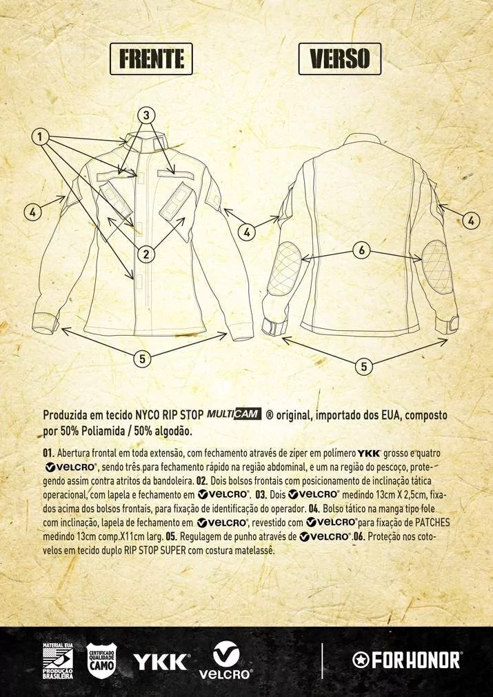A Gandola preta da For Honor é produzida produzida em tecido RIP STOP composto por 65% poliéster / 35% algodão. Com fechamento em zíper e quatro velcros, sendo três para fechamento rápido na região abdominal, e um na região do pescoço, protegendo assim contra atritos da bandoleira. Regulagem no punho em velcro, proteção nos cotovelos em tecido duplo RIP STOP.
