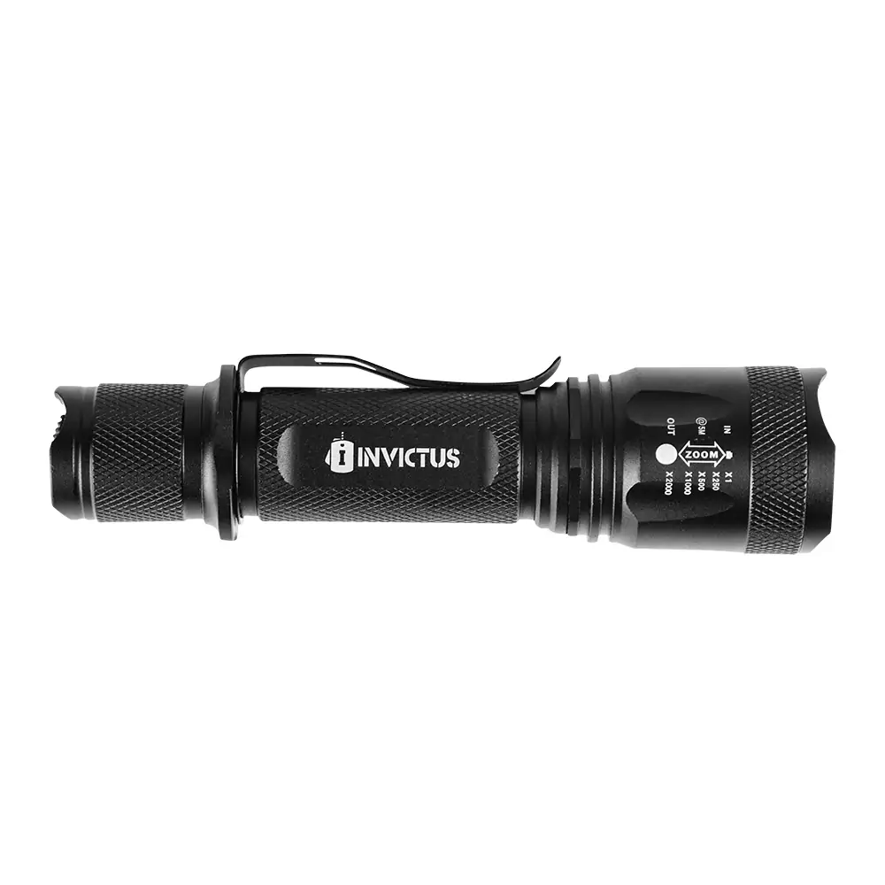 A Lanterna Tática Sirius 800 Lúmens da marca Invictus foi criada para o uso tático em geral. Ela contém 5 modos de operação: luz alta, média, baixa, estrobo e SOS, acionados de forma sequencial. Já sua capacidade luminosa é de 800 lúmens e autonomia de 4 horas. Possui zoom e design tático com características específicas que colaboram com o operador tático em situações do dia a dia, como a arruela removível de auxílio de empunhadura, clipe removível e carregamento micro USB lateral com indicador de carga, além de empunhadura ergonômica e textura antiderrapante.