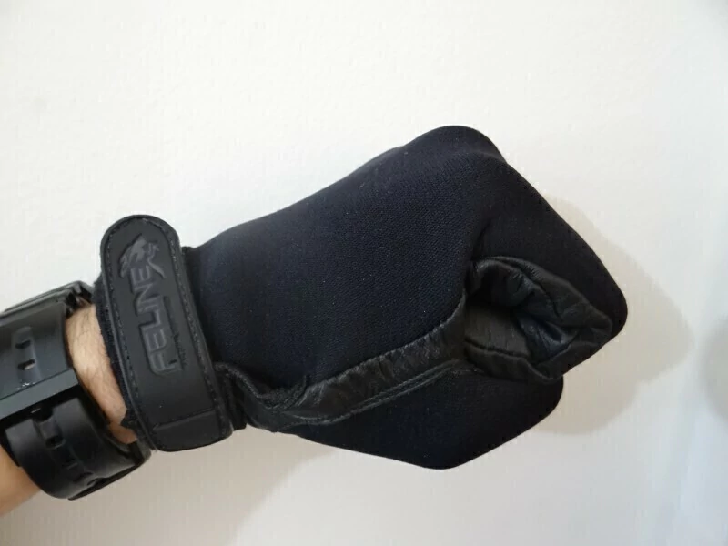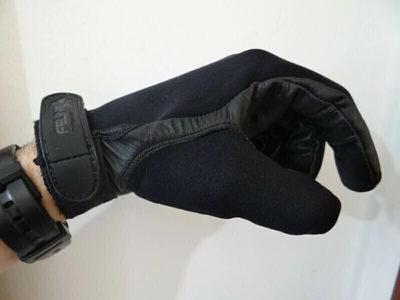 Couro invertido nas pontas dos dedo e lateral externa da mão (exceto indicador) visando oferecer maior resistência nas partes em contato e maior aderência.