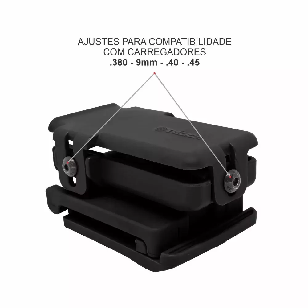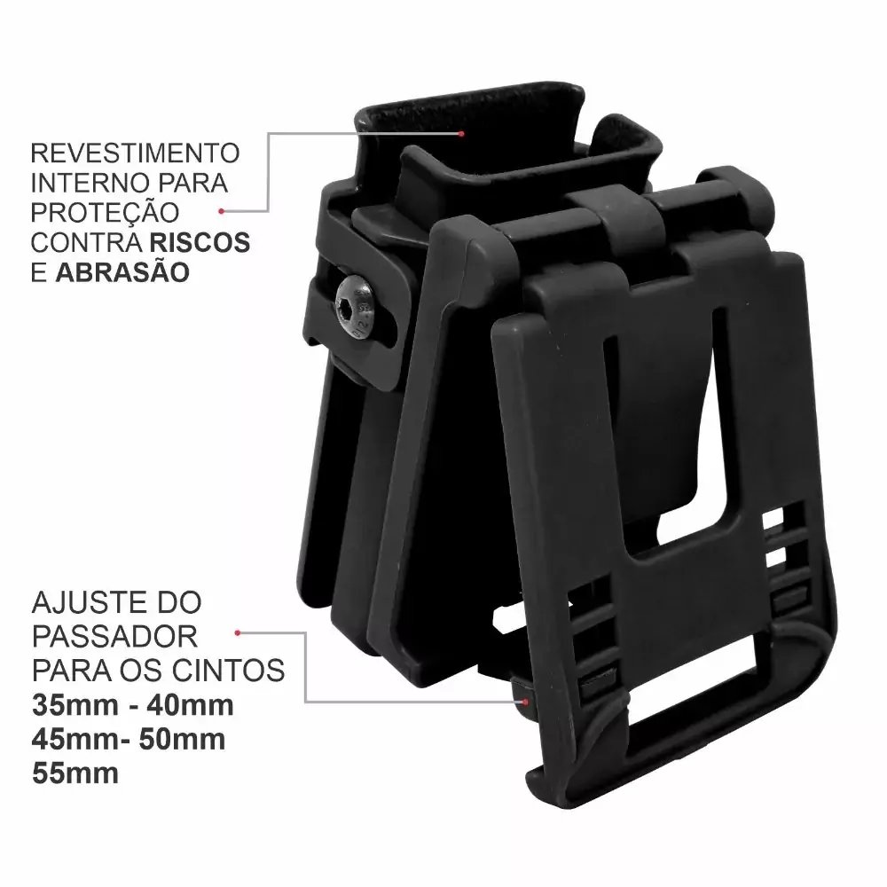 O Porta Carregador Universal Mono trás versatilidade com os ajustes de 3 pontos na pressão e encaixe dos carregadores .380, 9mm, .40 e .45 onde uma simples regulagem irá manter seu carregador seguro e preparado para ação com a proteção necessária feita pelo revestimento interno flocado, protegendo o carregador contra risco e abrasão. O passador de cinto embarcado é o modelo FAST que pode ser vestido sem a necessidade de remover o cinto, e claro, compatível com cintos de 35mm, 40mm, 45mm, 50mm e 55mm.