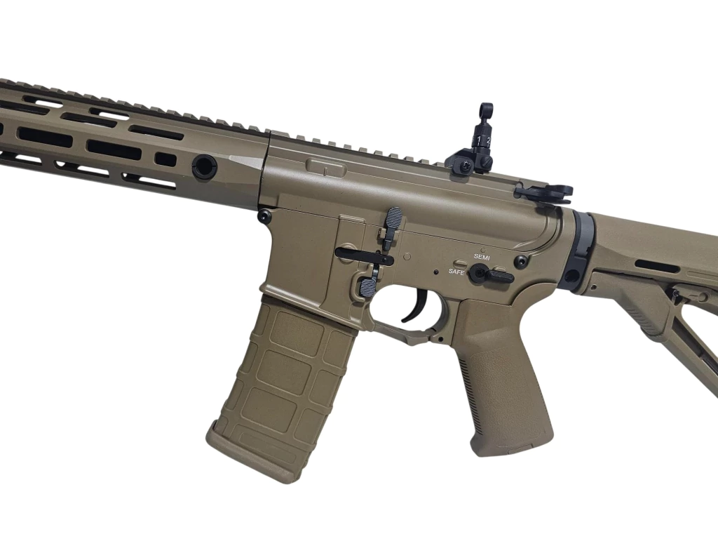Equipado com gearbox E&C V2, o modelo oferece funcionamento confiável nos modos semi e full automático, além de seletor de segurança. Seu sistema é compatível com gels de 7 a 8 mm, proporcionando disparos consistentes e boa precisão. O handguard com padrão M-LOK e trilho superior Picatinny permitem personalização com acessórios táticos, como miras e grips.
