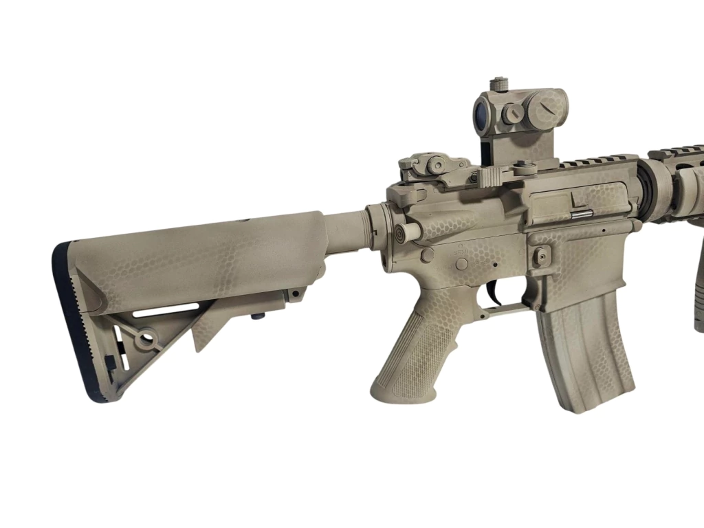 Transforme sua experiência de combate tático com a Pintura Personalizada Padrão Cobra! Este acabamento exclusivo não apenas proporciona um visual impressionante ao seu equipamento, mas também aumenta a camuflagem em ambientes variados.