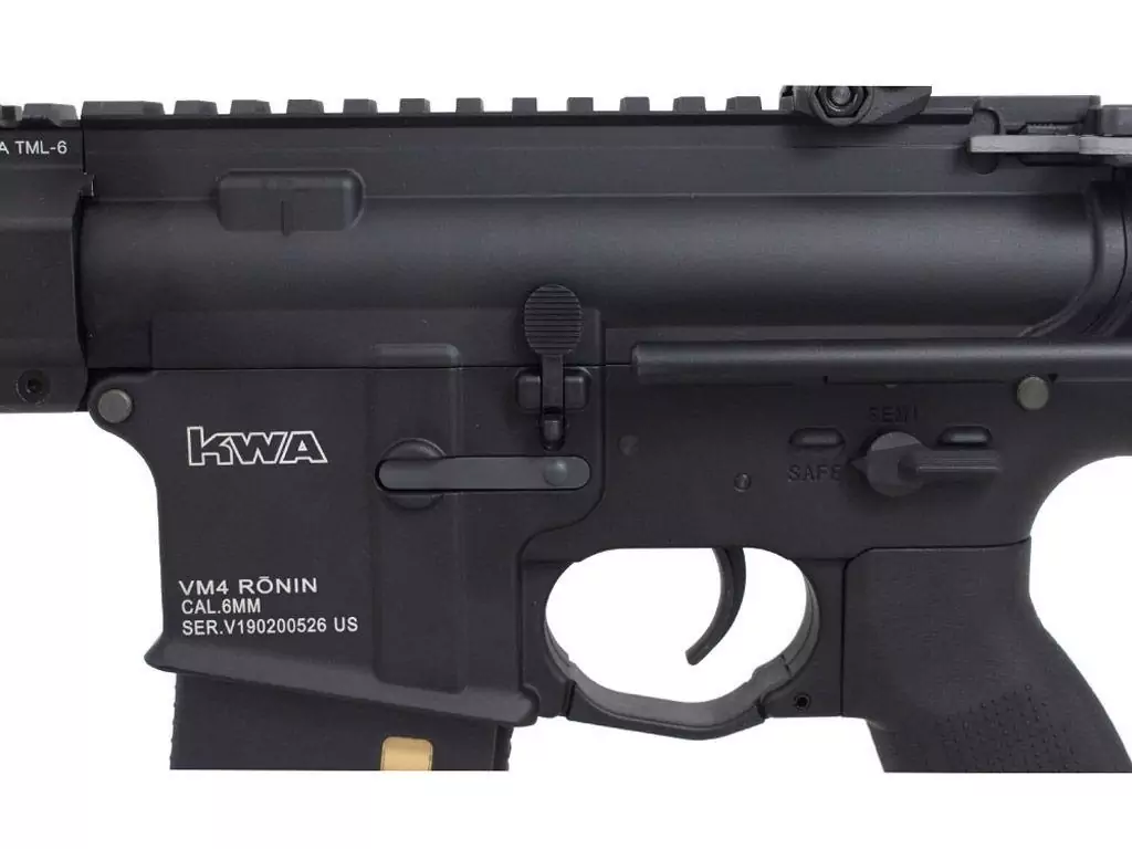 Rifle de airsoft VM4 RONIN T6 da marca KWA1, conta com um hand guard M-LOK de 6 polegadas feito em metal, compatível com os sistemas de trilho M-LOK. Possui três modos de disparo: Safe, Semi-Auto e Full-Auto, com uma velocidade de até 370 FPS.