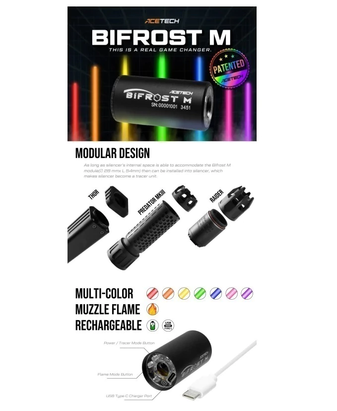 O Acetech Bifrost M é um módulo tracer compacto e poderoso, projetado para simular um efeito visual impressionante de chama multicolorida ao disparar. Ideal para uso com airsoft, oferece desempenho de alta qualidade e versatilidade.